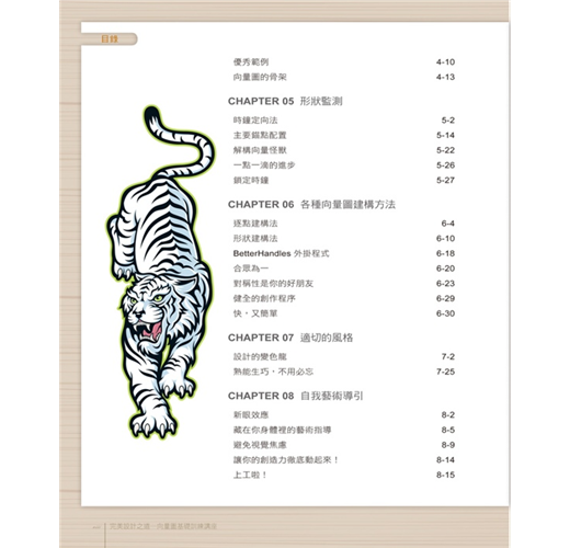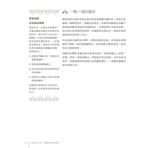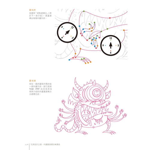 作者將帶領您體驗其系統化的創作程序,透過此程序將能創造出專業化的精準向量圖,與單純使用軟體工具創造出來的作品截然不同。他將利用這個程序使您的繪畫技巧更成熟,並深刻體會如何建立出優雅美觀的向量圖曲線及精準的錨點。