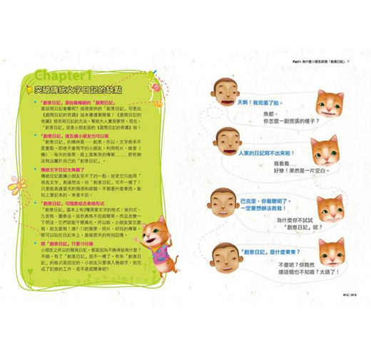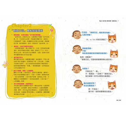 「創意日記」是一本專門為孩子設計的「日記術」。「創意日記」希望孩子透過活潑的格式,在每日記錄中,看見自己的美好,也挖掘出潛藏的才華和興趣,能在未來的人生中大展長才。