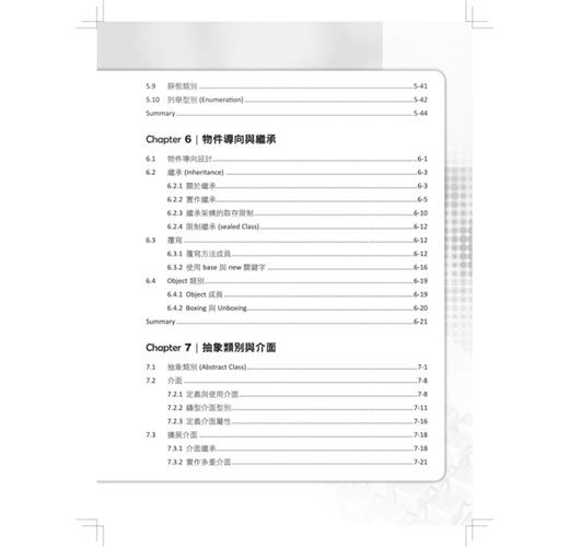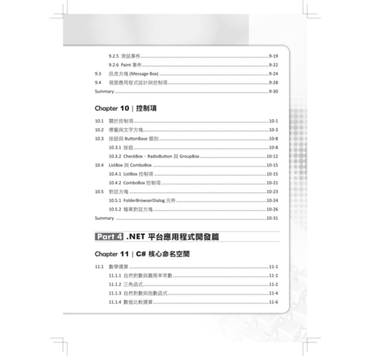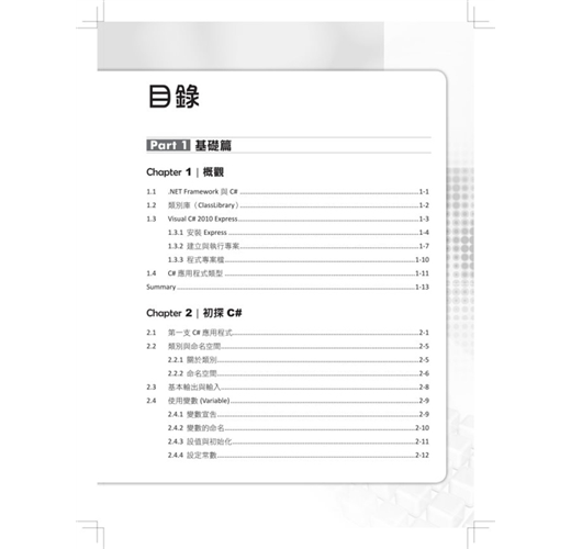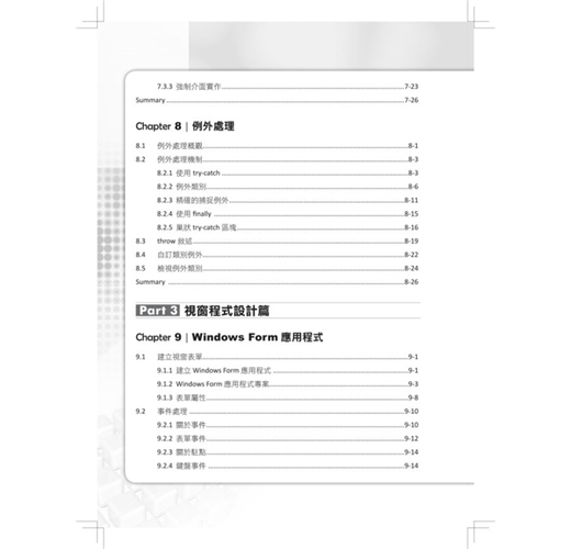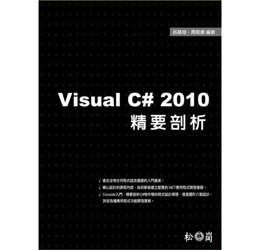 從基礎程式語法介紹到各類廣泛的C#技術主題,本書均提供了相關的探討與精要的實作範例說明,內容分成四大主題:「基礎」、「類別與物件導向程式設計」、「視窗程式設計」與「.NET平台應用程式開發」。