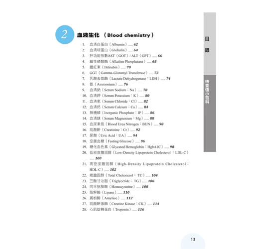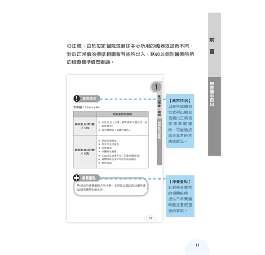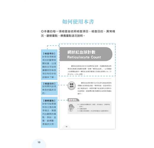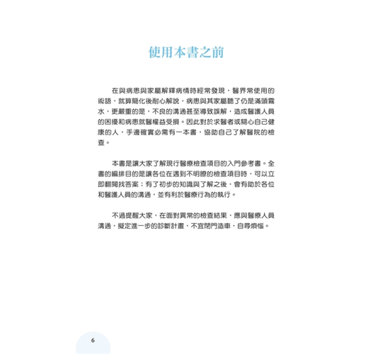 本書以清晰、簡要、易懂的說明與編排方式,讓你可以快速翻閱查詢想要了解的檢查值。本書內容包括: