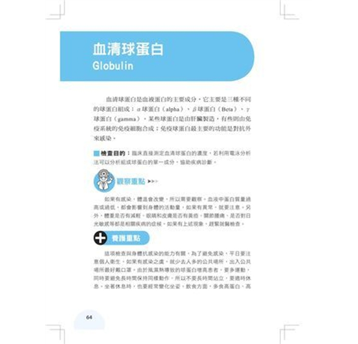對於一般患者沒有醫學方面深入的知識,很難了解實驗診斷所代表的意義和嚴重性。本冊以淺顯的文字解釋,並且以清晰的表列和強調臨床上重要的保養須知提醒患者,或應