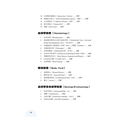 本冊是由台北榮總內科資深主治醫師韓志陸博士撰寫,內容簡潔扼要,淺入深出,易於參考查閱,不僅適合醫、護及檢驗人員,亦可供病患及其家屬之衛生教育及實際使用。
