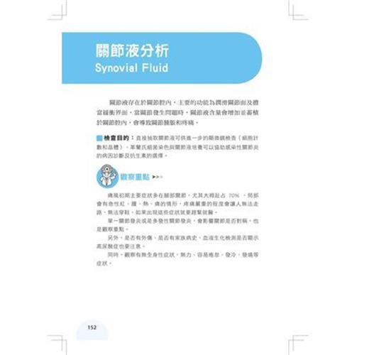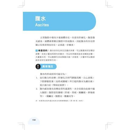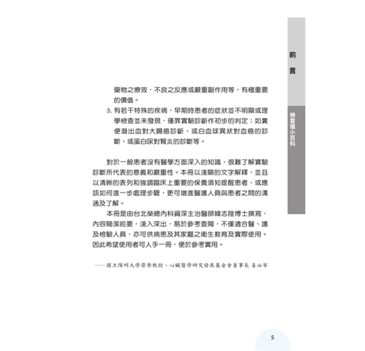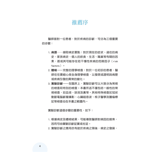 3. 實驗診齗—在臨床上,實驗診齗可以大致分為常規的檢查和特別的檢查。本書所述不僅包括一般性的常規檢查,如血液、尿液及糞等。其他特殊檢查如冠狀動脈電腦齗層攝影、心臟超音波、核子醫學及腫瘤標記等檢查也在本書之範圍內。