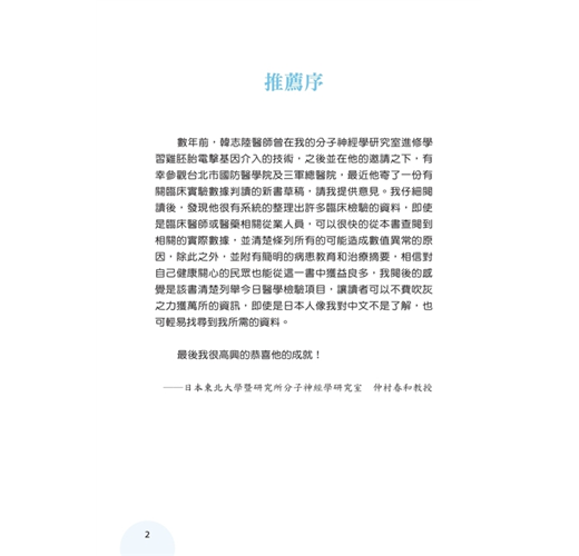 數年前,韓志陸醫師曾在我的分子神經學研究室進修學習雞胚胎電擊基因介入的技術,之後並在他的邀請之下,有幸參觀台北市國防醫學院及三軍總醫院,最近他寄了一份有關臨床實驗數據判讀的新書草稿,請我提供意見。我仔細閱讀後,發現他很有系統的整理出許多臨床檢驗的資料,即使是臨床醫師或醫藥相關從業人員,可以很快的從本書查閱到相關的實際數據,並清楚條列所有的可能造成數值異常的原因,除此之外,並附有簡明的病患教育和治療摘要,相信對自己健康關心的民眾也能從這一書中獲益良多,我閱後的感覺是該書清楚列舉今日醫學檢驗項目,讓讀者可以不費吹灰之力獲萬所的資訊,即使是日本人像我對中文不是了解,也可輕易找尋到我所需的資料。