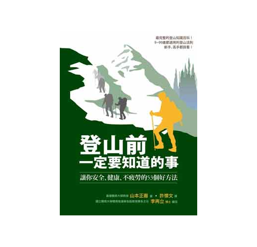 有別於一般坊間的登山書刊,《登山前一定要知道的事》是一本集安全、舒適、健康等知識於一書的登山專業書籍。作者依登山與健康、疲勞、性別及各年齡層、體力訓練、攀岩、高地登山等不同類別,佐以各項數據、圖表,有系統地加以剖析,內容極其豐富,是登山者之寶典。