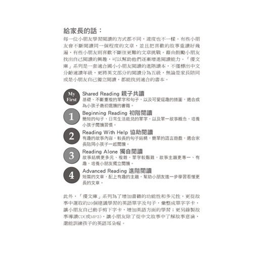 「優文庫」是一套適合國小孩童閱讀的好書。閱讀習慣的養成又是培養兒童語言能力的要素。以充滿故事性的閱讀引領進入英語學習,對小朋友來說,相信除了可以提供閱讀的樂趣之外,更可以培養英語學習的興趣。對於家長及教育工作者來說,故事中不僅充滿教育意義,能提供小朋友好的品德教育,更是引領小讀者進入學習英語的一個很好的入門及途徑。