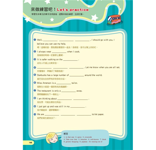 每個情境單元後都附有十題練習題,將前面出現過的重點單字或用語做挖空填充練習,並隨機出題,複習已學習過的重點單字及用語,加深印象,忘不了。