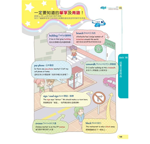 1. 圖解延伸單字及用語:只學漫畫中的單字及用語可不夠,每個情境單元再延伸出15-20個與該情境相關的單字及用語,並搭配生動的彩色圖像,讓你快速學習並靈活運用,說出更豐富的口語。