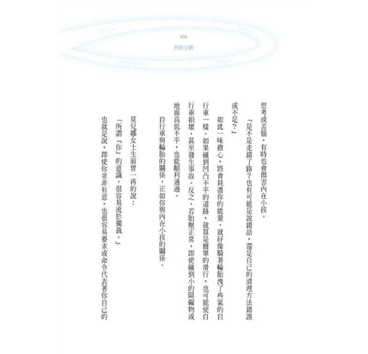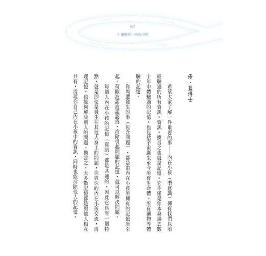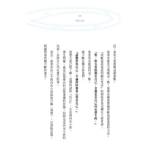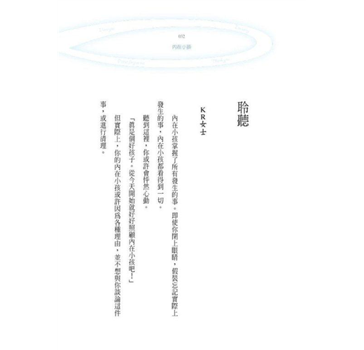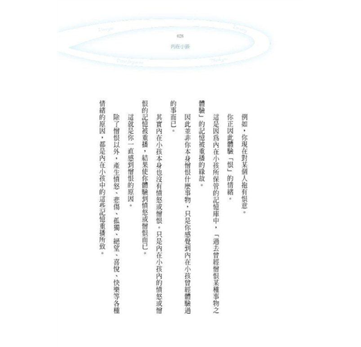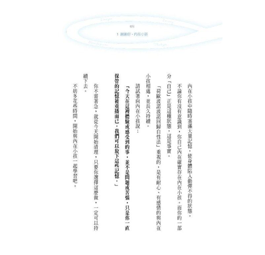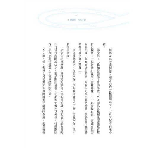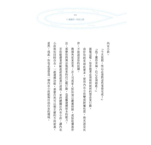 「內在小孩是我們最好的朋友。能得到這個小孩的信賴,才能體驗真正的自我。讓「真正的自我」,亦即真正的身分,站在生存的起點上。」