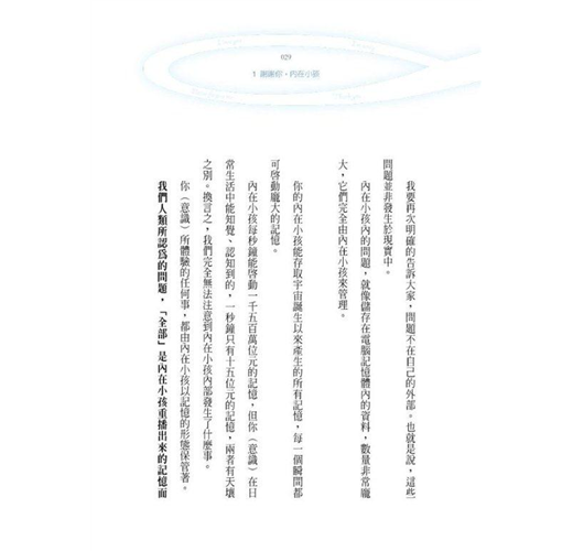 內在小孩每秒鐘能啟動一千五百萬位元的記憶。但是你(意識)在日常生活中能知覺、認識到的,一秒鐘只有十五位元的記憶。兩者有天壤之別。換言之,我們完全無法注意到內在小孩內部發生了什麼事。