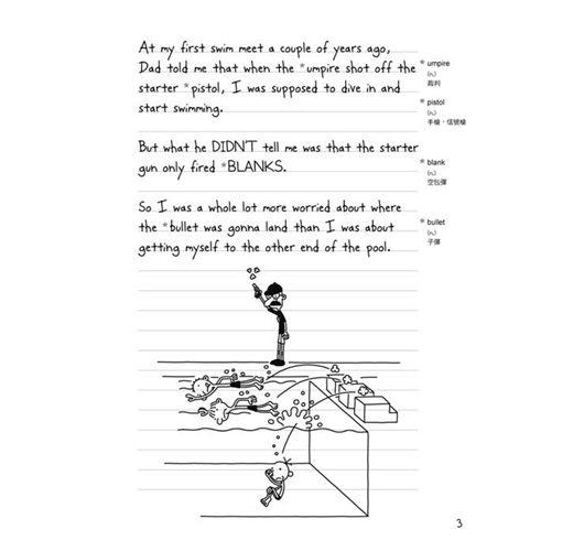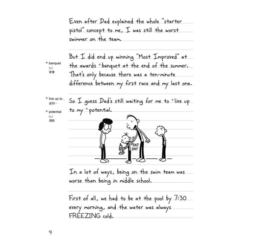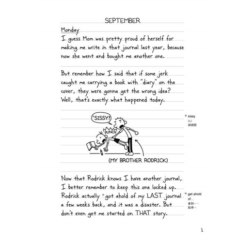 Diary of a Wimpy Kid has become a must for every learner of English to read. Once you start reading it, you will be instantly captivated by its stylish and practical juvenile language as well as its simple yet jocular cartoon illustrations. Read it a moment, and your pleasure lasts a long time. The more often you read it, the better your English will get. You can read it ten minutes per time and/or diary by diary. Never will you be alone if you spend time--lying, sitting, or standing--with it. Plus, keep reading it, and you keep young. That is how it can keep a firm grip on you. All in all, Diary of a Wimpy Kid is an awesome book worth a read. Whoever or whatever you are, the fact that you hold such a book in your hands is a step in the right direction.