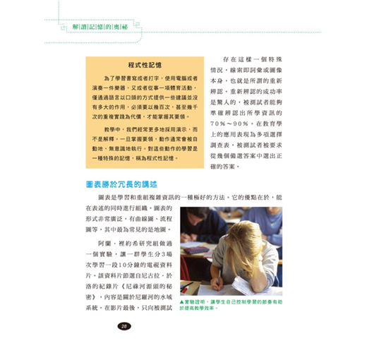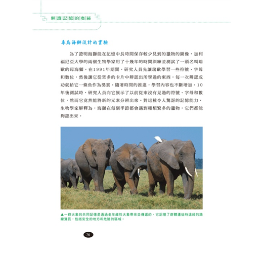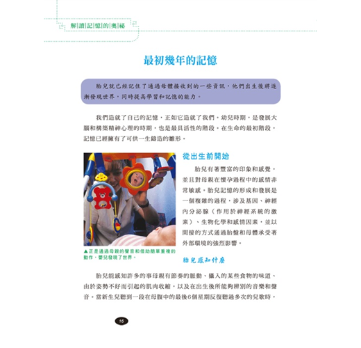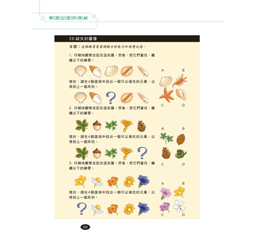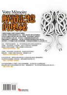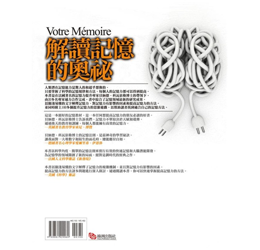 也許有一天,大家都會抱怨記憶力「衰退」,但這並非災難。在明白了我們的記憶是如何]二作之後,我們可以使它的效能達到最大化,從而提高學習能力、工作能力和生活能力。這是一本被譽為「世界上最偉大的記憶書」,在法國著名的記憶力提升專家貝納德科瓦依勒博士的帶領下,由20多位元心理學、生物學、醫學專家合作完成,綜合了記憶領域最新的研究成果,以淺顯易懂的語言解釋了記憶的複雜機制,並提供了完善的、全新的和容易理解掌握的記憶理念和記憶方法。同時,書中設計的大量遊戲和練習有助於讀者根據自己的步調與具體的物件,找到並發展適合自己的記憶方法。