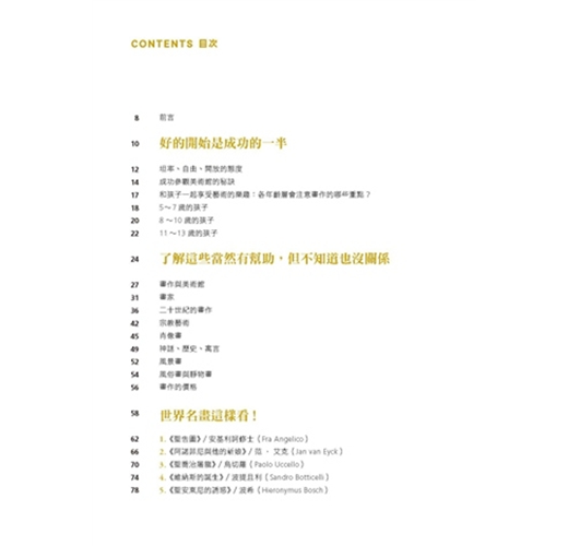 滿足好奇心或適合自己的讀書方式,對每個人來說都不太一樣。隨著時間長短或心情的不同,讀者可能有時會覺得說明的篇幅太短,有時又覺得一次讀一段就夠了。你可以翻到哪裡看到哪裡,可以帶在身邊以便隨時掏出來看,甚至可以從後面開始讀!只要大家最後能覺得「藝術……其實沒那麼難嘛」,這樣就夠了!