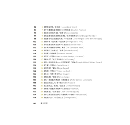 這裡並沒有包含所有的名畫,本書所收錄的畫作是從中世紀到現代,為了更了解多樣的繪畫世界的基礎所選出來的。這些都是美術史上非常重要的作品,散佈在世界各地的美術館中,也可以在畫冊中看到它們的複製品。