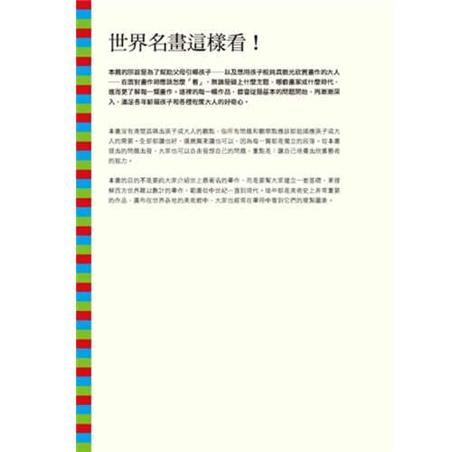 本書只提供藝術欣賞時需要的線索,讀者完全不必具備藝術或歷史知識,也不需要有教學經驗。這不是美術史教科書,完全沒有經常讓大家感到挫折的歷史解說或術語這一類內容。