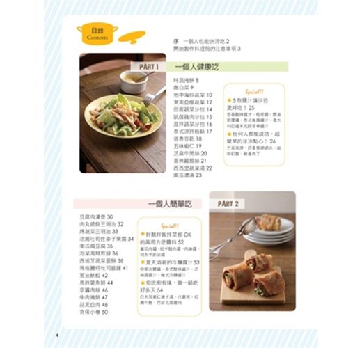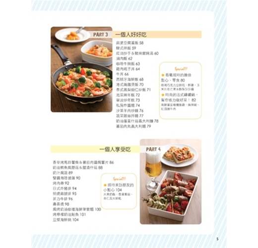另有「Special!!特集」單元,包含萬用的沙拉醬汁、基本拌麵拌飯醬料、重看重用的時尚鑄鐵鍋美食、看電視的點心良伴、超簡單蛋糕點心等主題,徹底實踐一個人好好吃的生活吧!