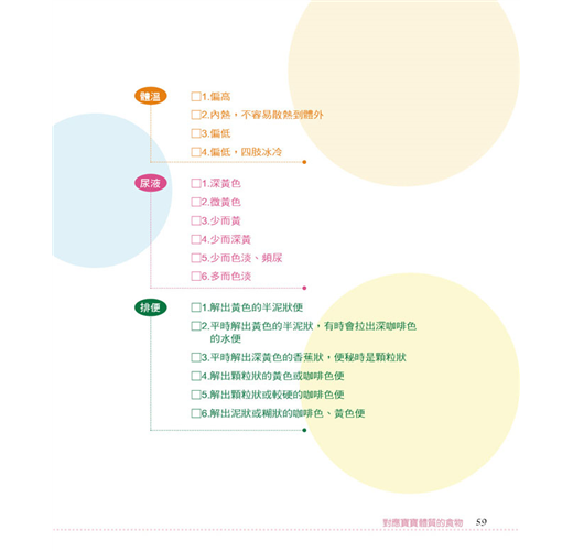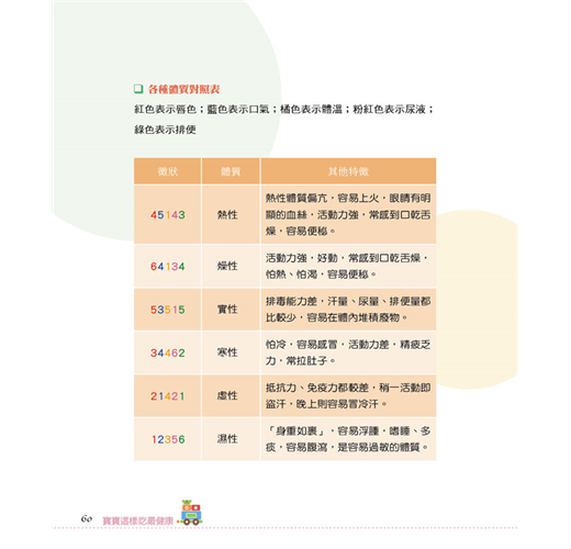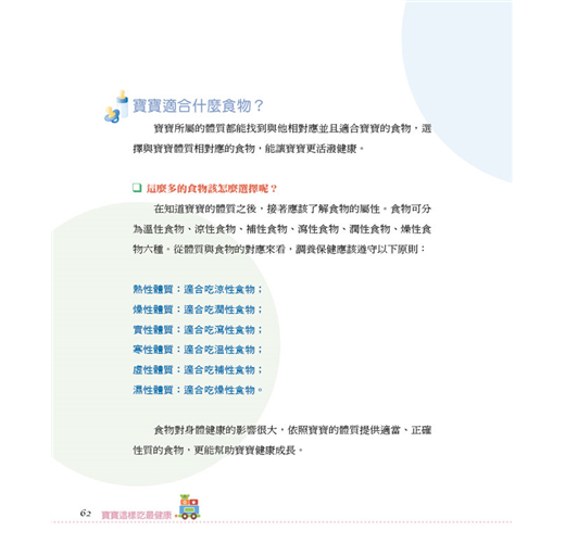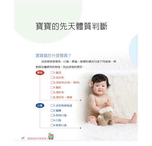 寶寶所屬的體質都能找到與他相對應並且適合寶寶的食物。食物對身體健康的影響很大,依照寶寶的體質提供適當、正確性質的食物,更能幫助寶寶健康成長。