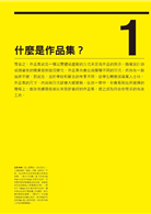 作者一開始簡約地說明何謂「作品集」之後,馬上切入主題,把作品集分為「學生作品集」和「專業作品集」兩大類型:前者是申請設計學校和在校生到外面找實習機會,後者適用於新人找工作或在職者昇遷換跑道。這兩大類型的作品集針對的對象不同,作品集審閱者的心態也不一樣,裏頭的東西和呈現的方式當然也要有所不同。搞錯對象,牛頭不對馬嘴,再美麗的作品集,也只是一個美麗的錯誤。