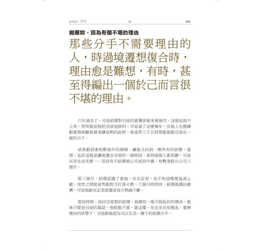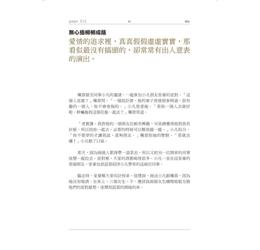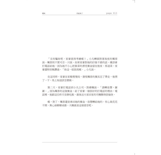 在台北,筱凡的戲約還算頻繁,這讓她也沒有時間多想她跟品勛的事,偶爾跟朋友聊起這事,朋友也聽得出她的遺憾,因為不想跟圈內人交往的她,好不容易認識一個有品味的圈外人,卻因小事分手,實在不值得。