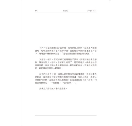 這個安安靜靜的助理,很快引起電視公司一個髮型師的注意,有天,她又到咖啡廳看書的時候,髮型師端了杯咖啡走近她,「妳是翁姐的助理,對不對?我叫潔米。」「你好,我知道你,你是髮型師,化妝間見過你。」「嗯,我是髮型師,可是我不是gay。」「是gay也很好啊,我很多朋友都是gay。」「這當然,不過就不會過來找妳搭訕了。」就這樣,兩人開始聊起來。