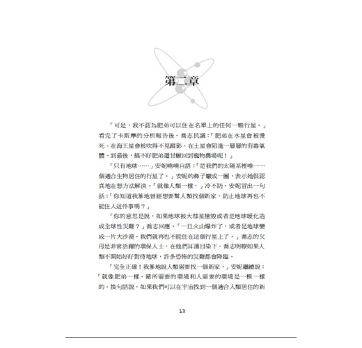 瑞普一身黑,彷彿要融進他身後那一大片黑漆漆的天地。除了光禿禿、表面布滿隕石坑洞的灰色石頭之外,周遭空無一物。喬志試著要站起來,可是,全身的肌肉早因為這趟太空旅行而變得軟弱無力,連要起身都有點吃力。