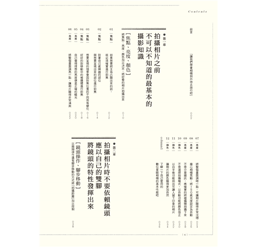 本書已將任何人都可以立即上手的攝影基礎知識加以彙整。讀者不需從頭開始學起,只需從有興趣的地方開始實際拍攝相片即可。多多拍攝相片,累積實務經驗為攝影技術得以提升的最佳捷徑,而且這也可以讓我們將相機運用得駕輕就熟。