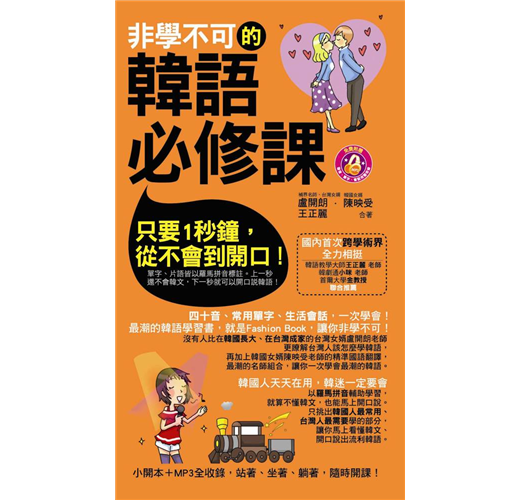 10X17公分方便摧帶的開本,搭配由韓籍老師錄製的全書四十音、單字及會話MP3,讓你走到哪學到哪,學習零空隙,零時差,站著、坐著、躺著,隨時都上課,隨時都開講。