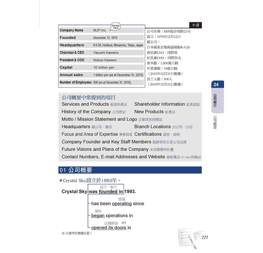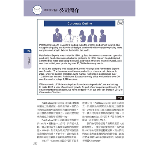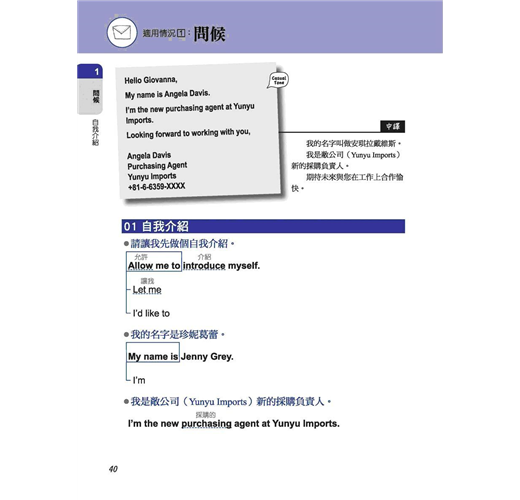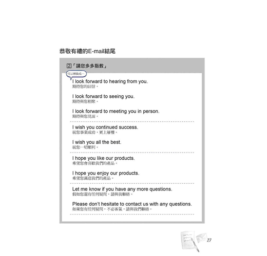 附25個常用商業主題,包括詢價、請託、談判、訂購、緊急事件與約定會面等,並提醒讀者如何不掉入「中式英文」的陷阱。用最基本的句型與字彙應用在最廣泛的地方,用這個簡單的方法,就能輕鬆寫出一封封「簡潔有力、正確傳達」的英文書信!