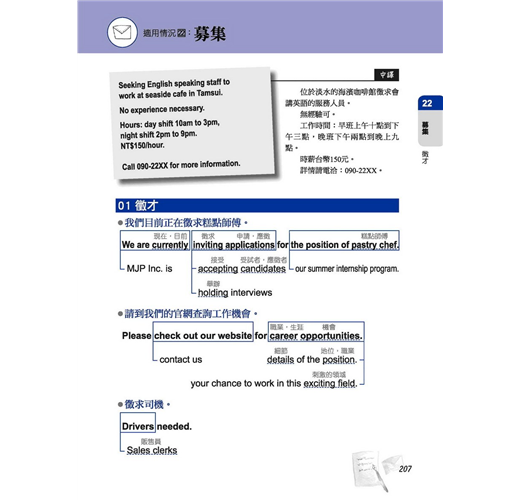 本書提供工作上或日常生活裡各種情境的字彙和例句,讀者可以配合自己的需求自行置換詞彙,實際應用。以英語為母語的老師們也在書中提出許多建議,請大家務必善加利用,努力擺脫隨口說出錯誤英語的習慣。