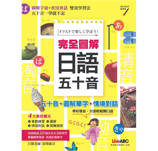 日語50音是學習日語的基礎,如果能將基礎打好,不論讀者們是為了準備升學就業或純粹興趣娛樂,相信都能更輕鬆的去面對無限的挑戰。學習新語言沒有偏方,也沒有所謂的十分鐘速成。選擇這本《完全圖解日語五十音》當做學日語的出發點,你將會發現原來學發音也可以這麼有趣這麼容易。我們希望幫讀者打下穩紮穩打的基礎,讓你得到更多事半功倍的高效率學習。相信對於日後的進階日文,會更有幫助喔!