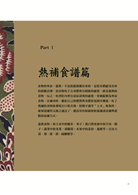 本書分成「熱補」、「溫補」、「甜點」三部分。在補身時,應依自己的體質與身體狀況循序漸進。例如一個手腳冰冷的虛勞族,吃了熱補的食物後發現有口乾舌燥,煩躁不適等「上火」現象時,就知道補得太操之過急了,應該用比較緩和如溫補或涼補與甜點的滋補方式。先用溫和的補法,把「地基」打好了,再用比較強的滋補方式,達到食養的目的。