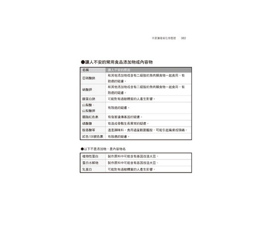 乍看之下,業者在產品上標明了添加物的內容,確實保護了消費者的權益,但事實上,消費者雖然看到一整排的添加物名稱,卻仍然不明白那些添加物到底是什麼。我認為消費者有必要好好學習,了解哪些是具危險性的添加物(會在第三章詳細說明)。