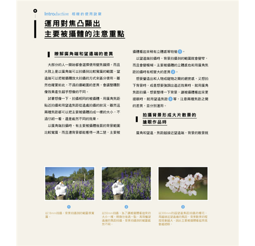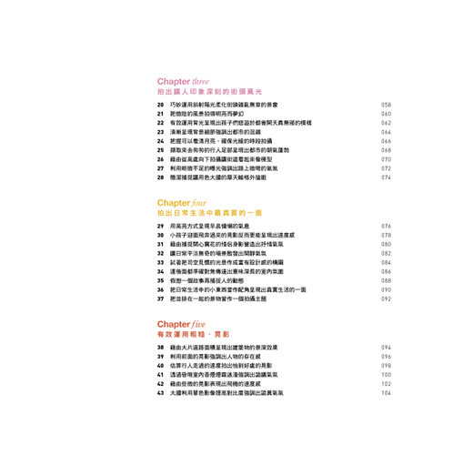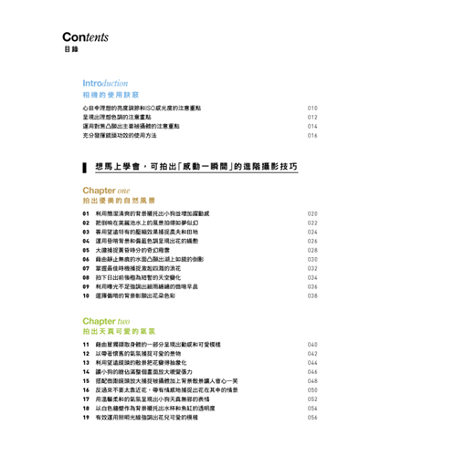 於是,本書比『拍出感動的一瞬間』多增加了一些可以作為實際參考的實例相片。只要參考這些相片,並靈活運用在自己的攝影上,一定可以拍出更有氣氛、更賞心悅目、更生動活潑的「獨特氛圍作品」。