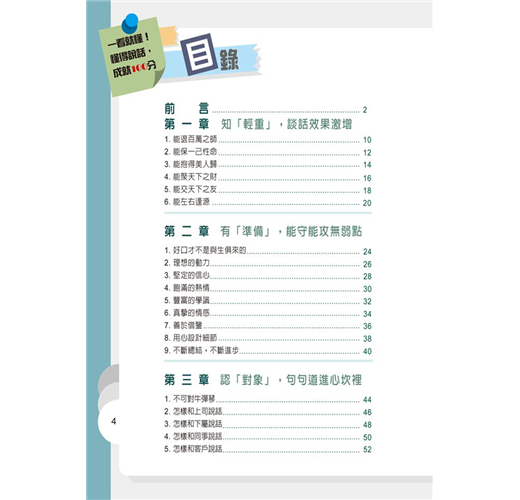 說對話,讓諸葛亮促成孫、劉聯合,從而徹底改變三國時代天下的格局和走勢;說對話,紀曉嵐讓乾隆皇帝收會賜死的旨意;說對話,二次大戰期間,英國首相邱吉爾讓全國人民傾力抗戰……會說話,說對話,小則可以升官發財,功成名就;大則可以興邦治國,成為位高權重的領導者。針對特別需要運用說話技巧的現代人, 本書提供古今中外許多名人小故事,讓您從中掌握說話的訣竅,快速站上人生的高峰!一看就懂!超強版說話技巧全方位大公開