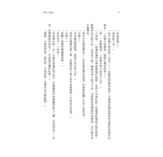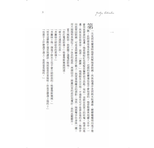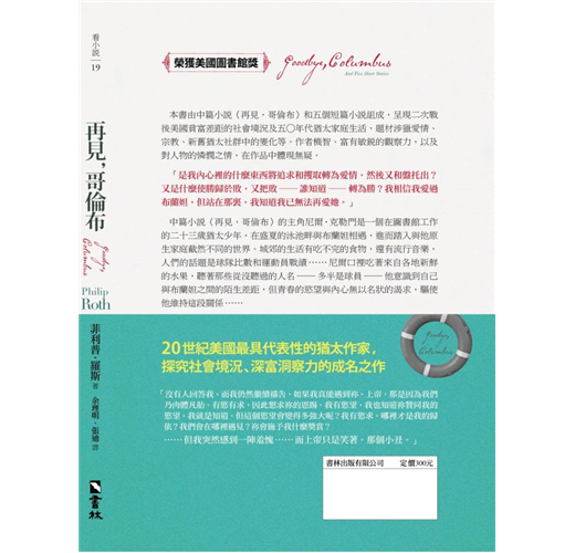愛情除了「我愛你」之外,還參雜了什麼?《再見,哥倫布》由中篇小說〈再見,哥倫布〉和五個短篇小說組成。全書呈現二次戰後美國貧富差距的社會境況及五○年代猶太家庭生活,題材涉獵愛情、宗教、新舊猶太社群中的變化等。作者機智、富有敏銳的觀察力,以及對人物的憐憫之情,在故事中體現無疑。這第一部出版的中篇故事不僅是羅斯的成名作,也是之後所有故事的雛形。
