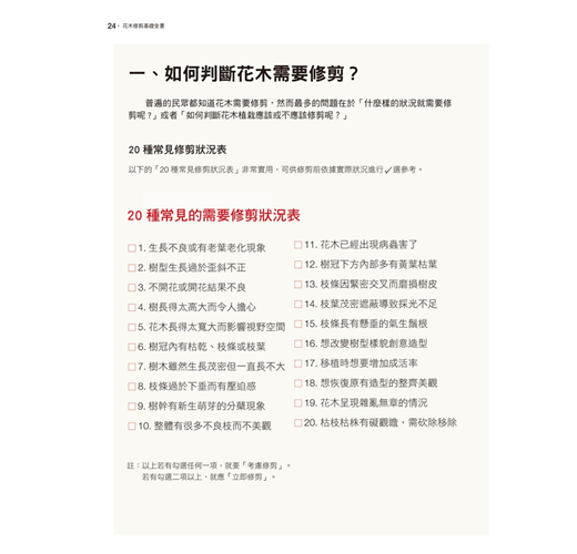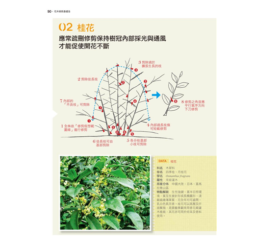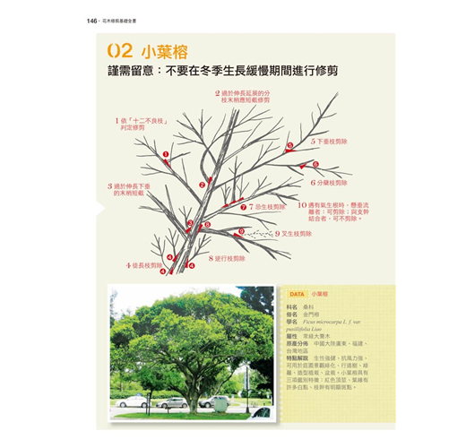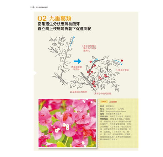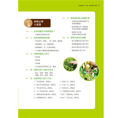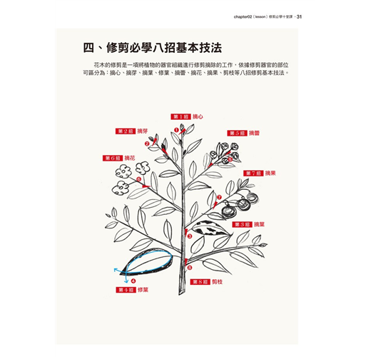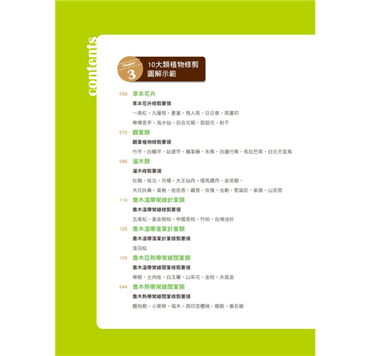 2. 圖解示範,針對10大類植物100種植物詳細的修剪示範,佐以插畫解析。