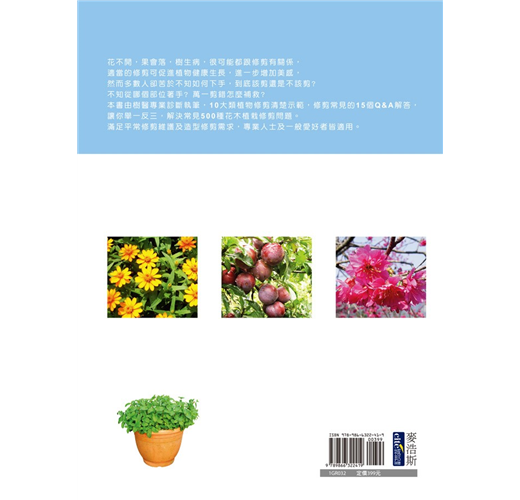 本書由樹醫專業診斷執筆,10大類100種植物的修剪清楚示範,解決常見 500種花草植栽修剪問題。全書超過2000張圖解,滿足平常修剪維護及造型修剪需求,專業人士及一般愛好者皆適用。