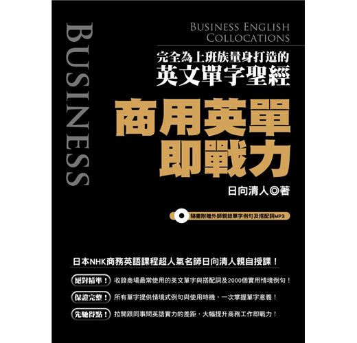 想從同事之間脫穎而出,除了運氣之外還要靠實力!專業的商務單字用法,絕不像一般生活單字那樣只要會背就能輕鬆學會。作者日向清人以累積的豐富業內教學經驗,給你最詳細專業的單字學習。唯有這本,才能讓你提升真正的商務英語實力!
