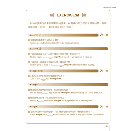 ◆ 每個單字並提供完整例句,呈現該單字或搭配詞的使用方法。