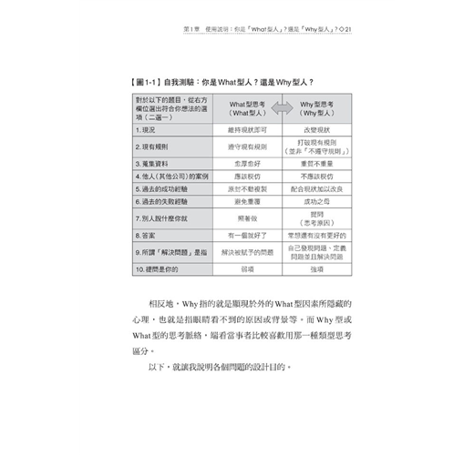 此外,我在書中將習慣Why型思考的人(就字面意義)暱稱為「Why型人」,而將What型思考的人(指對於交代事項只會聽命行事的習性)暱稱為「What型人」,並比較這兩種類型的行為特性。