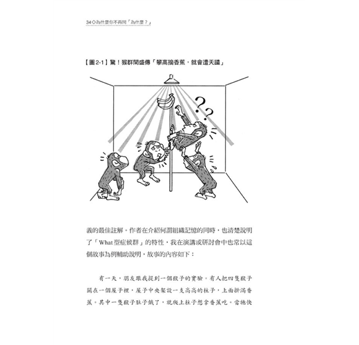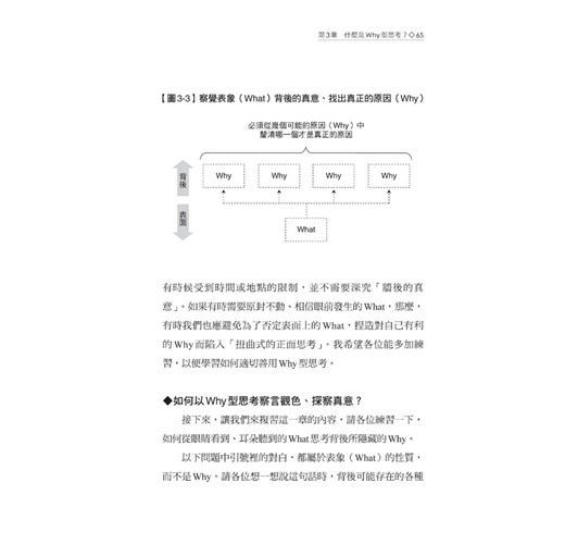 我認為,正因為上述的背景,讓我了解這兩種立場的不同;因此,我不僅了解如何從What型思考轉型為Why型思考,也知道轉型之後,伴隨而來的是擴展視野、個人成長,同時,更令人振奮與快樂(當然也有麻煩的時候)。所以,我想由我來介紹如何培養Why型思考,會更具說服力。