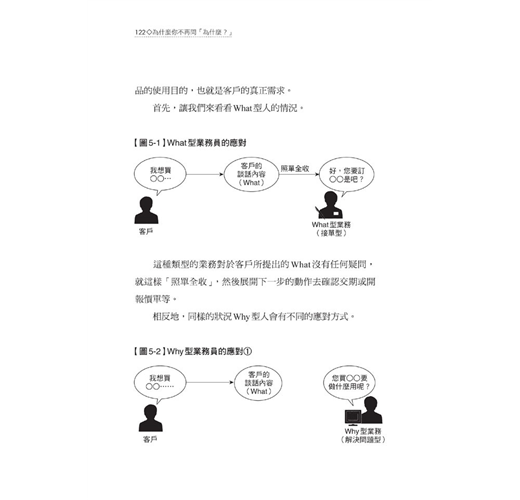 有關What型人與Why型人的應對差異,請看以下的圖示說明。在以上的案例中,所謂What是指客戶一開始所說的話,也就是「帶○○過來」。而Why是指客戶想購買的那個產品的使用目的,也就是客戶的真正需求。