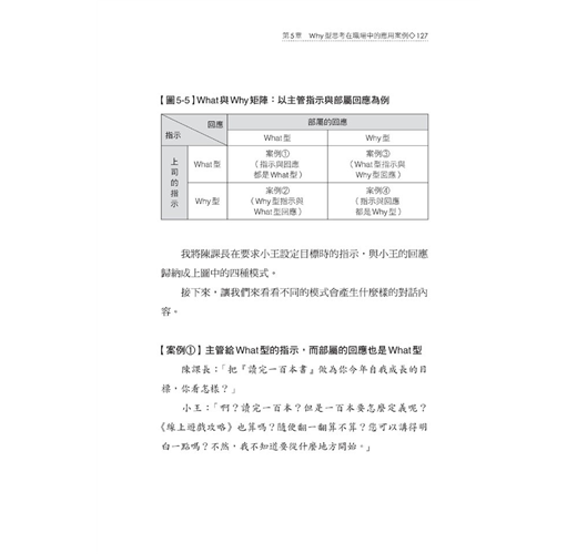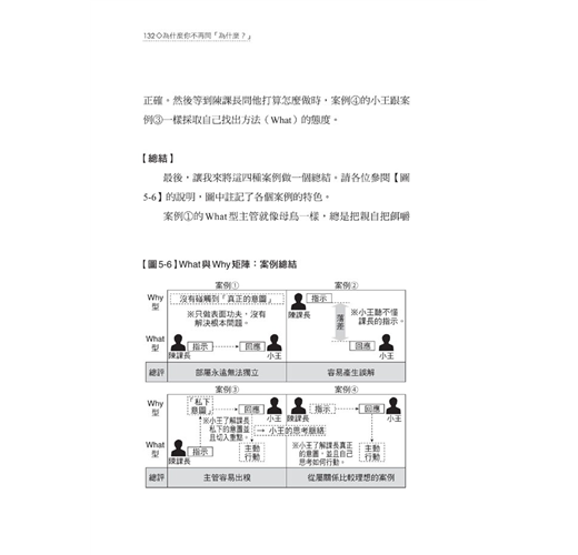 在案例4與案例2中,針對小王業績「原地踏步」的問題,陳課長同樣提供根本的解決方向(Why)指示小王應該「開拓視野」。但是,這個案例中的小王因為是一個Why型思考的人,因此在面對自己當下的問題時,主動在大腦中仔細驗證,並且確認自己得出的「視野狹隘」這個解答(Why)是否正確。然後等到陳課長問他打算怎麼做時,案例4的小王跟案例3一樣採取自己找出方法(What)的態度。