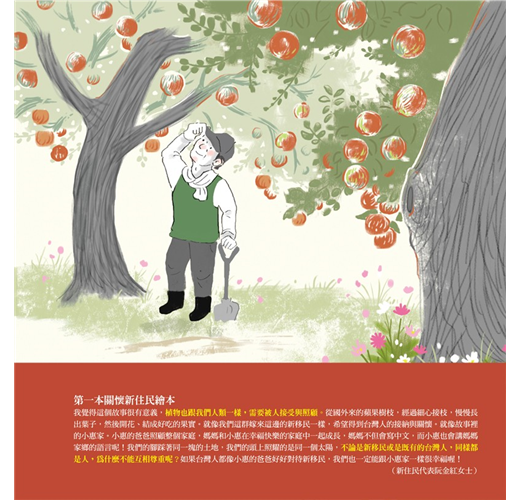我覺得這個故事很有意義,植物也跟我們人類一樣,需要被人接受與照顧。從國外來的蘋果樹枝,經過細心接枝,慢慢長出葉子,然後開花、結成好吃的果實。