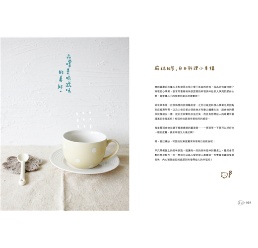 雖然不是技冠群倫的烹飪大師,但是愛吃,也愛下廚料理的麻球,堅持吃飯這件事是人生裡很重要的一件事。她說:「人跟食物的關係就像朋友一樣,彼此互相幫助,加油打氣!每當看到食物在鍋子裡噗噗噗的翻滾著,內心就有大大的感動和滿足呢。」因此總是用玩樂的心情打理一日三餐, 讓每一天的快樂心情都能延續到餐桌上。