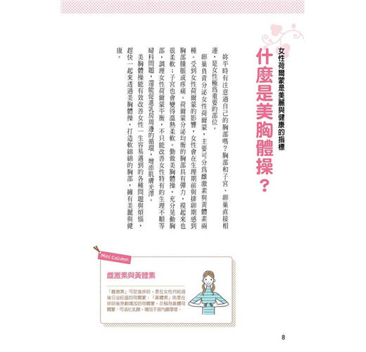 女性荷爾蒙是美麗與健康的指標什麼是美胸體操?妳平時有注意過自己的胸部嗎?胸部和子宮、卵巢直接相連,是女性極為重要的部位。卵巢負責分泌女性荷爾蒙,主要可分為雌激素與黃體素兩種。受到女性荷爾蒙的影響,女性會在生理期前與排卵期感到胸部腫脹或疼痛。荷爾蒙分泌均衡的胸部具有彈力,摸起來也很柔軟;子宮也會變得溫熱柔軟。勤做美胸體操,充分晃動胸部,調理女性荷爾蒙平衡,不只能改善女性特有的生理不順等婦科問題,還能促進乳房周邊的循環,增添肌膚光澤。美胸體操能有效改善女性一生容易遇到的各種問題與煩惱,趕快一起來透過...