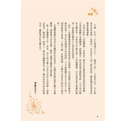 平胸、外擴、兩邊大小不一、下垂……只要是女性,多少都會有這些關於胸部的煩惱。本書介紹的「美胸體操」是為了解決這些煩惱而創造的運動。每天早晚各做一次美胸體操,只要持續勵行,就能擁有一對宛如棉花糖般柔軟的美麗乳房。並且還能改善血液與淋巴液循環,具有調整女性荷爾蒙平衡的效果。當女性荷爾蒙分泌均衡時,不只能喚醒女性天生的女人味,還能減輕生理痛、生理不順、肩膀僵硬、手腳冰冷與更年期的不適症狀等。