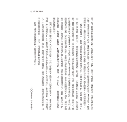 我近來漸漸覺得,船將划到盡頭;但能留下些什麼樣的紀錄呢?一生不懂理財,僅圖平平過日,哪有萬貫可以遺世或捐贈?因此,只能將平日點點滴滴的作品,彙編成冊,作為一種﹁個人的文化遺產﹂,留供社會。我這幾年來的孜孜整理,連年出書,全是為此。