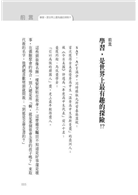 如果你很徬徨、找不到方向,不確定讀書對自己是有意義的,那麼這本書將會為你驅除迷障,帶來更為開闊與無限可能的世界。「學習是對人生應盡的禮儀」聽起來像是道德教條,但閱讀完本書後,你將會發現,作者是發自內心、毫不虛偽造作,秉持著這樣的觀念,認真、快樂的沉浸於每一天的學習挑戰。就像他說的,「我是一本還沒有結束的小說」,學習不單是在書中追根究柢、跟世界交流溝通,更應該是永遠的「現在進行式」。