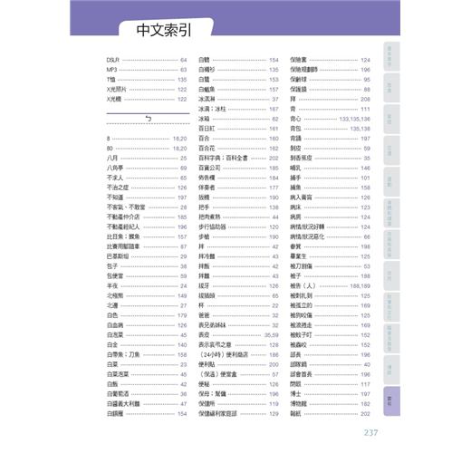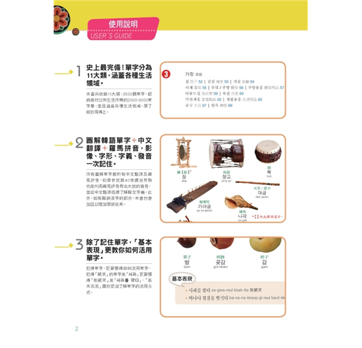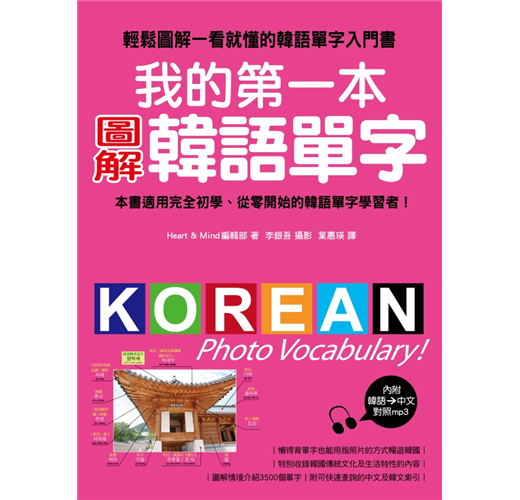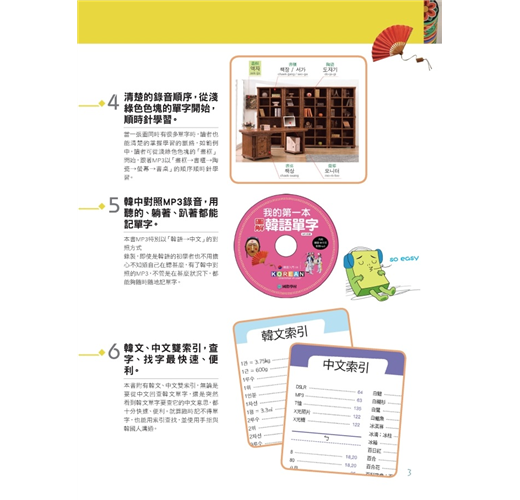 本書除了是一本韓語單字書,更是一本實用的韓語單字圖解字典!本書提供了韓文、中文雙索引,任何時候,腦中突然想到的中文,想要知道韓語怎麼說,就可以利用注音順序的中文索引找到相對應的韓語單字及圖片。眼睛突然看到不懂的韓文,也能利用韓文索引找到相對應的中文意思。